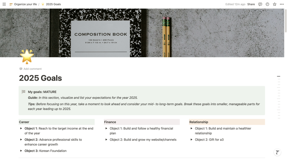 - Organize your life Template: Vision your life in the next 5 years (My vision, How to achieve my goals, Track my journey)